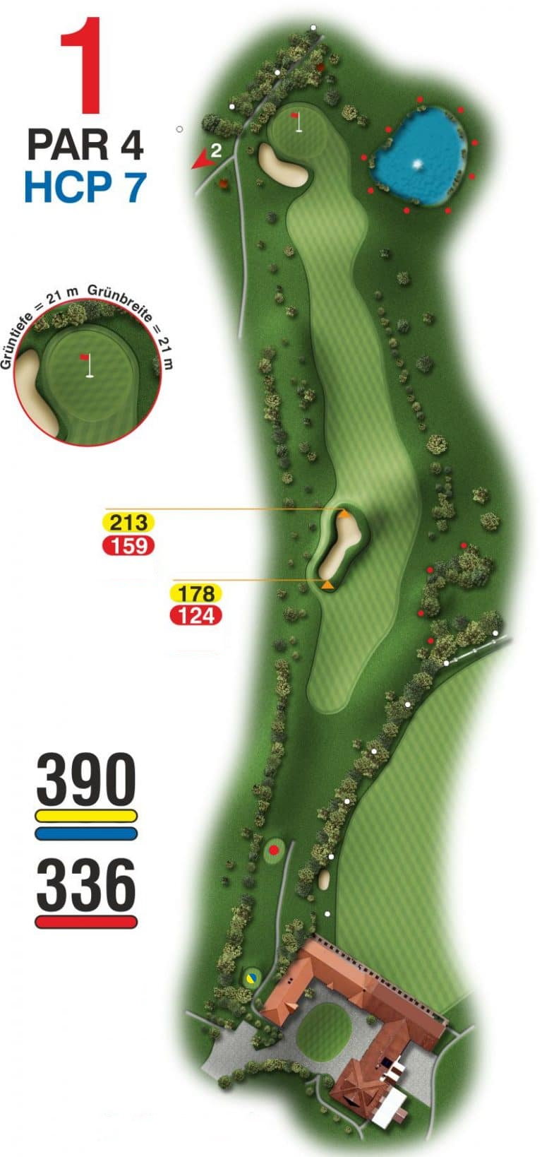 Für alle andern gibt es auch eine Ausgrenze rechts (zur Driving Range und hinterm Grün), Büsche und Bäume links, hohes Rough und Wasser rechts vom Grün, welches sich erst frühestens beim zweiten Schlag zeigt.