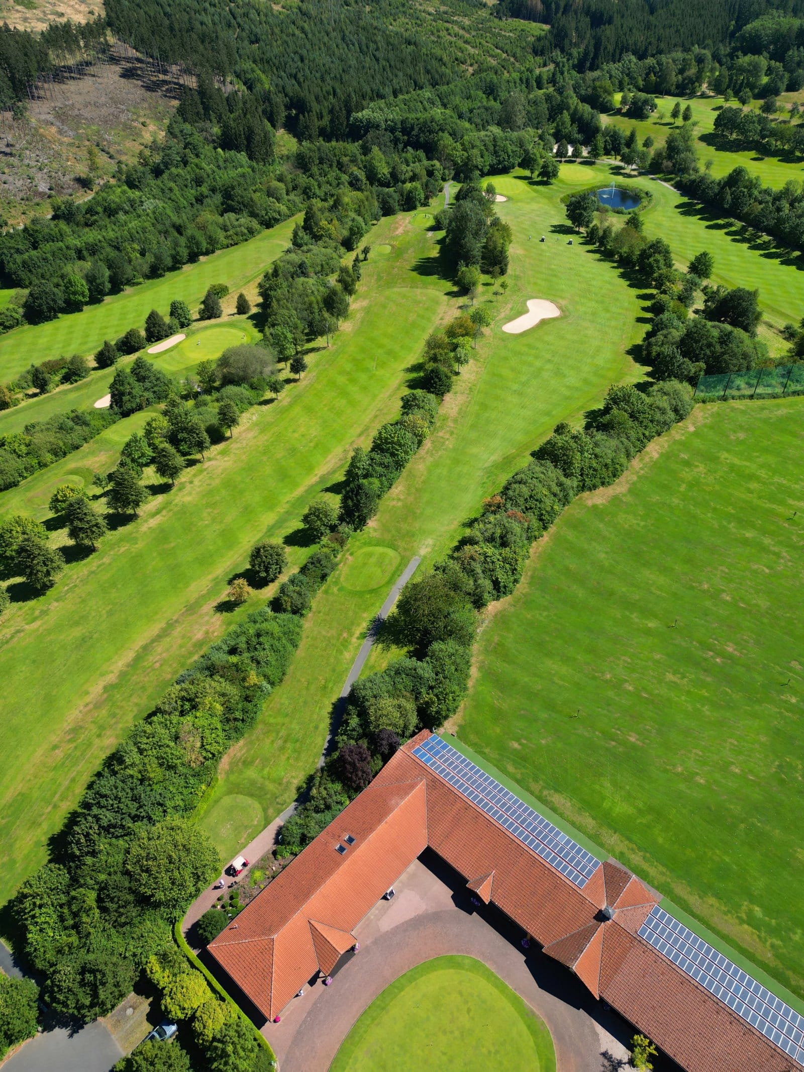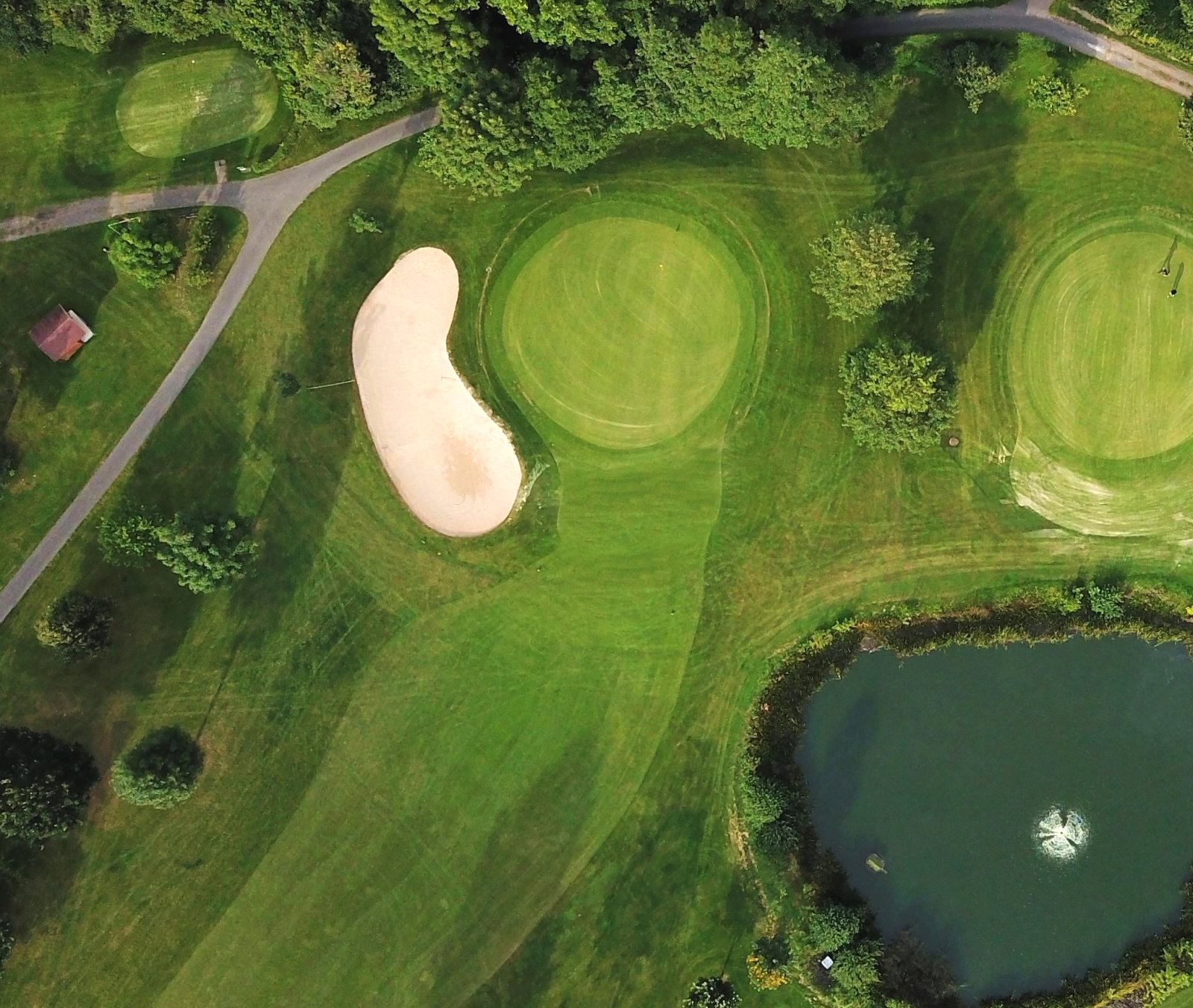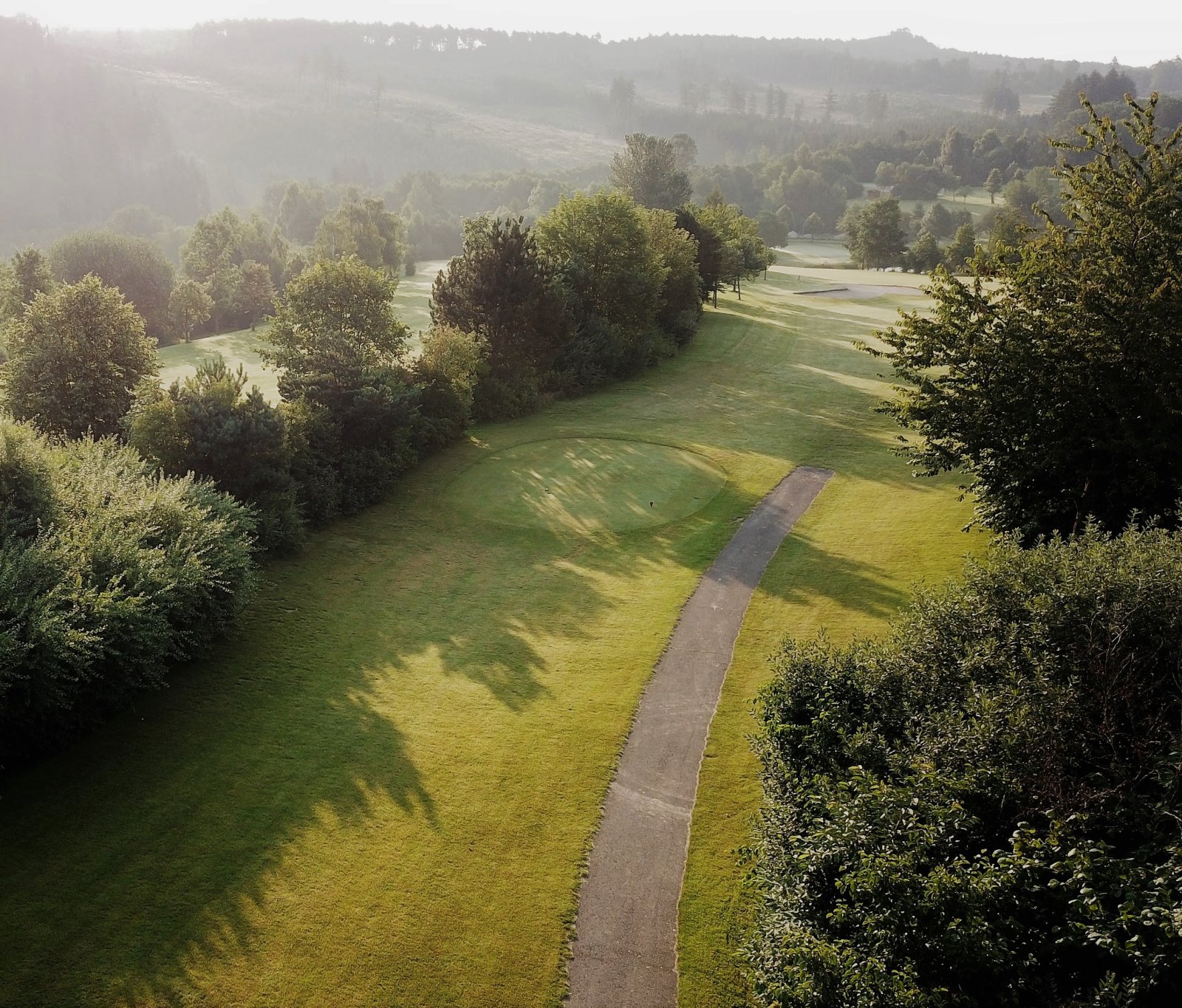Dieses Par 4 könnte der gemütliche Beginn einer entspannten Golfrunde im Kurhessischen Golfclub sein. Vom Abschlag zum Grün geht es fortwährend bergab. Aber bekanntlich sind Bunker ja immer da platziert, wo die guten Spieler ihren Ball hinspielen.