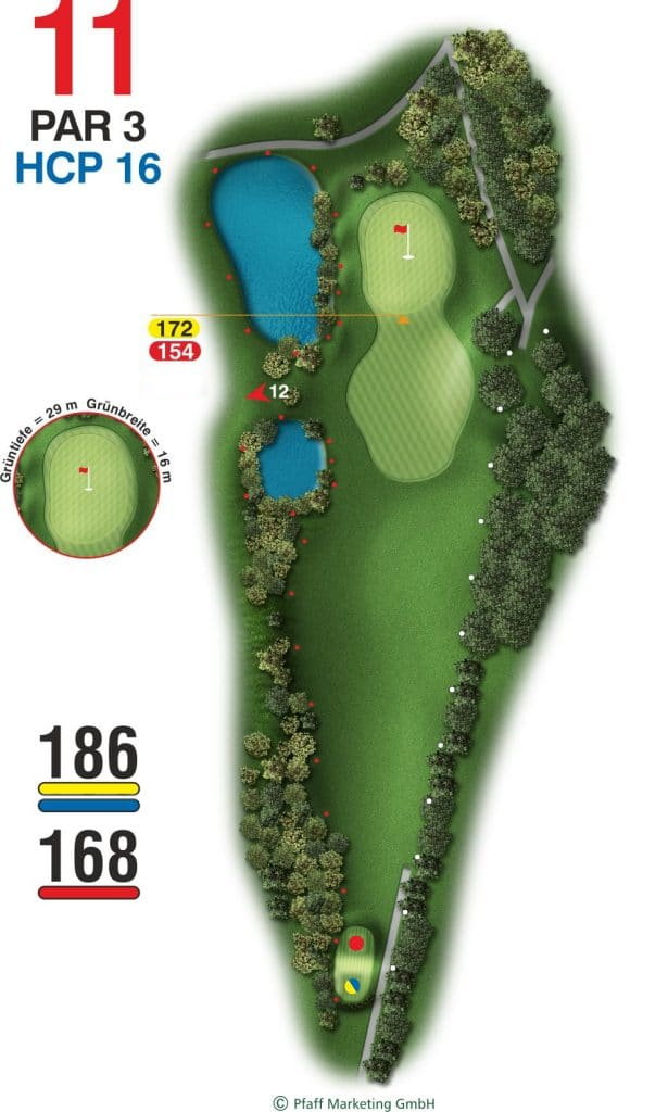 Hinter dem Grün geht es steil bergab. Hier heißt es absolute Präzision beim Abschlag. Sowohl der gute Draw als auch der gut gesetzte Fade erlauben das Anspielen des Grüns. Viel Spaß bei der Birdiejagd.