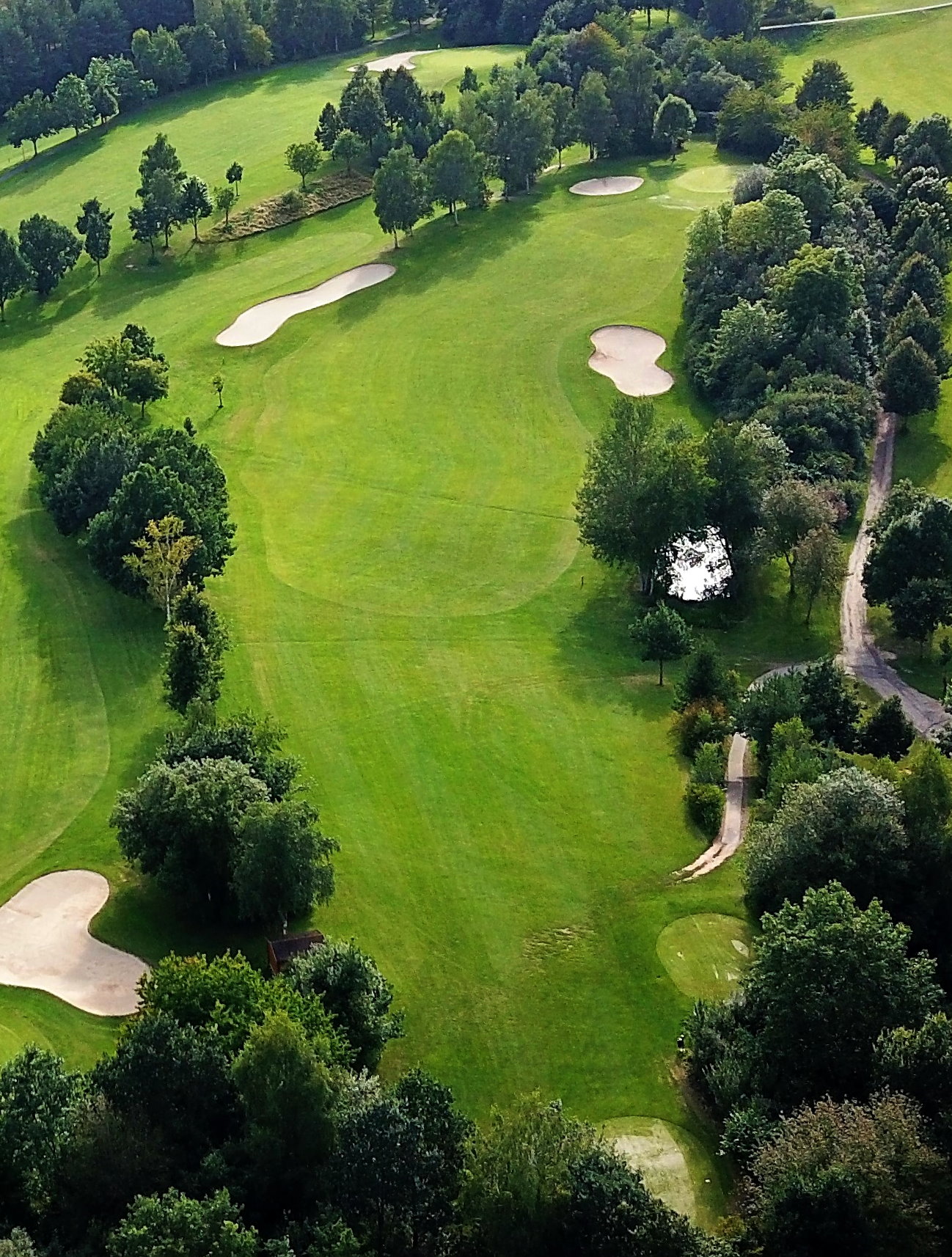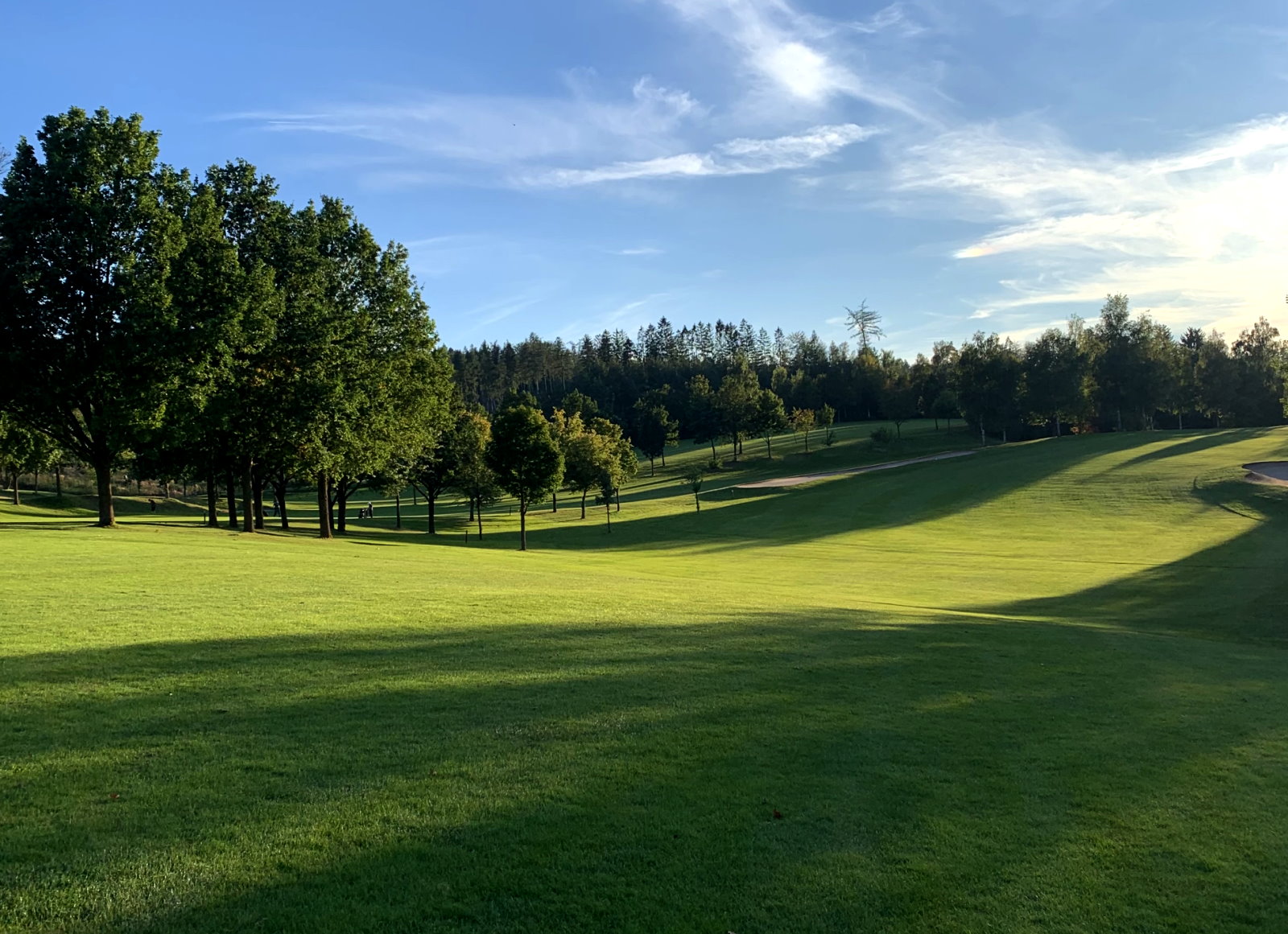 Mal ein Drive zur Entspannung. Es geht geradeaus bergab in die Senke, in der sich rechts ein kleiner Teich befindet, der von Bäumen eingerahmt wird. Der zweite Schlag auf dem Par 4 Loch geht steil bergauf aufs Grün.