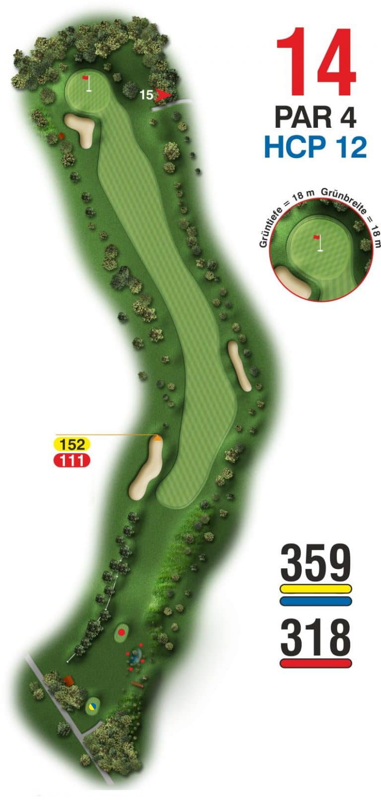 Das Par 4 hat es in sich. Es ist nicht gerade kurz. Man kann auf dem Dogleg links über einen Fairwaybunker zwar abkürzen, der sichere Weg ist jedoch geradeaus, wird aber frontal von einem weiteren Fairwaybunker behindert.
