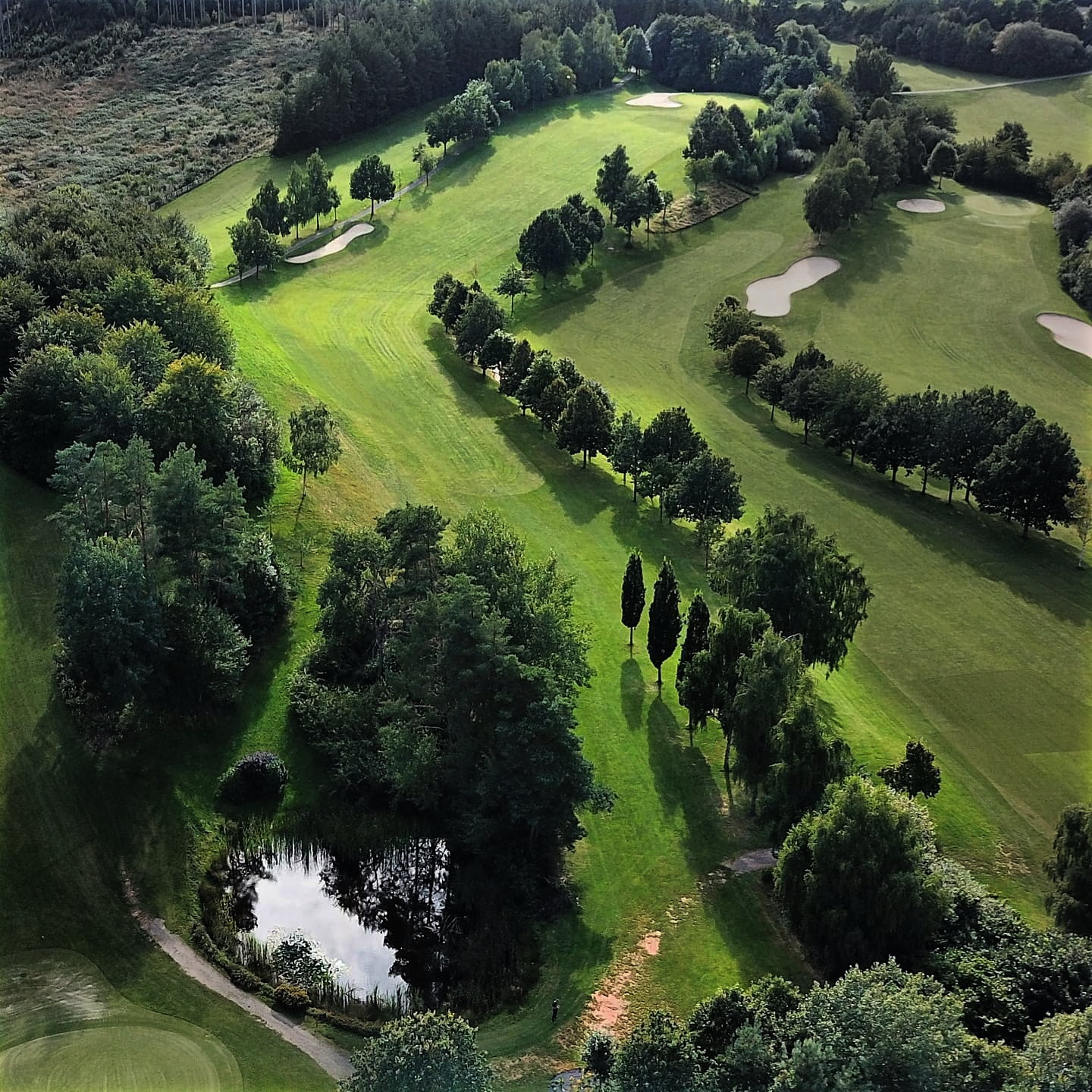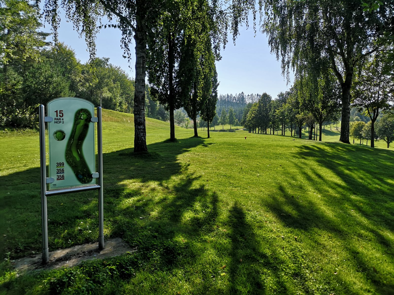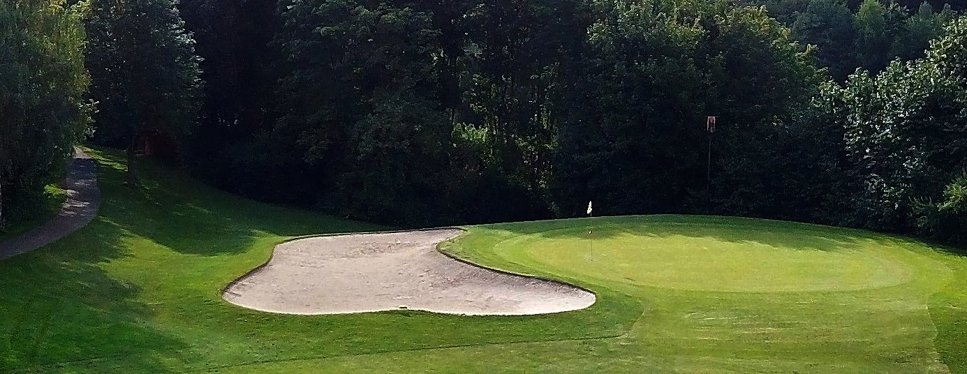 Das längste Par 4 ist erneut ein Dogleg, diesmal rechts. Der Drive der Herren wird durch ein Waldstück auf der linken Seite eingeschränkt. Liegt man in der „Kurve“ geht es bergauf zum Grün.