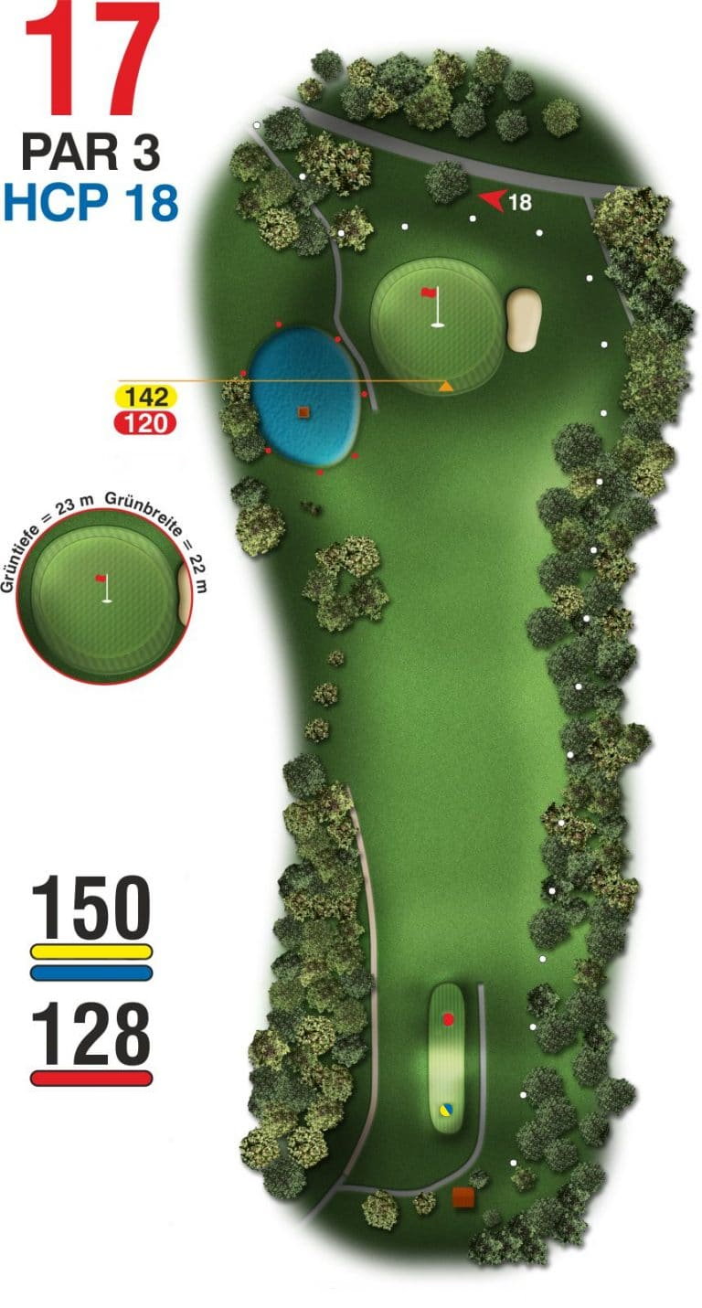 Das kürzeste Par 3 des Platzes lässt allen Spielern die Chance, mit dem Abschlag direkt auf das Grün zu spielen. Rechts entlang des Waldes droht eine Ausgrenze, genauso wie direkt hinter dem Grün.