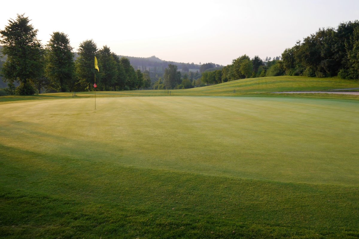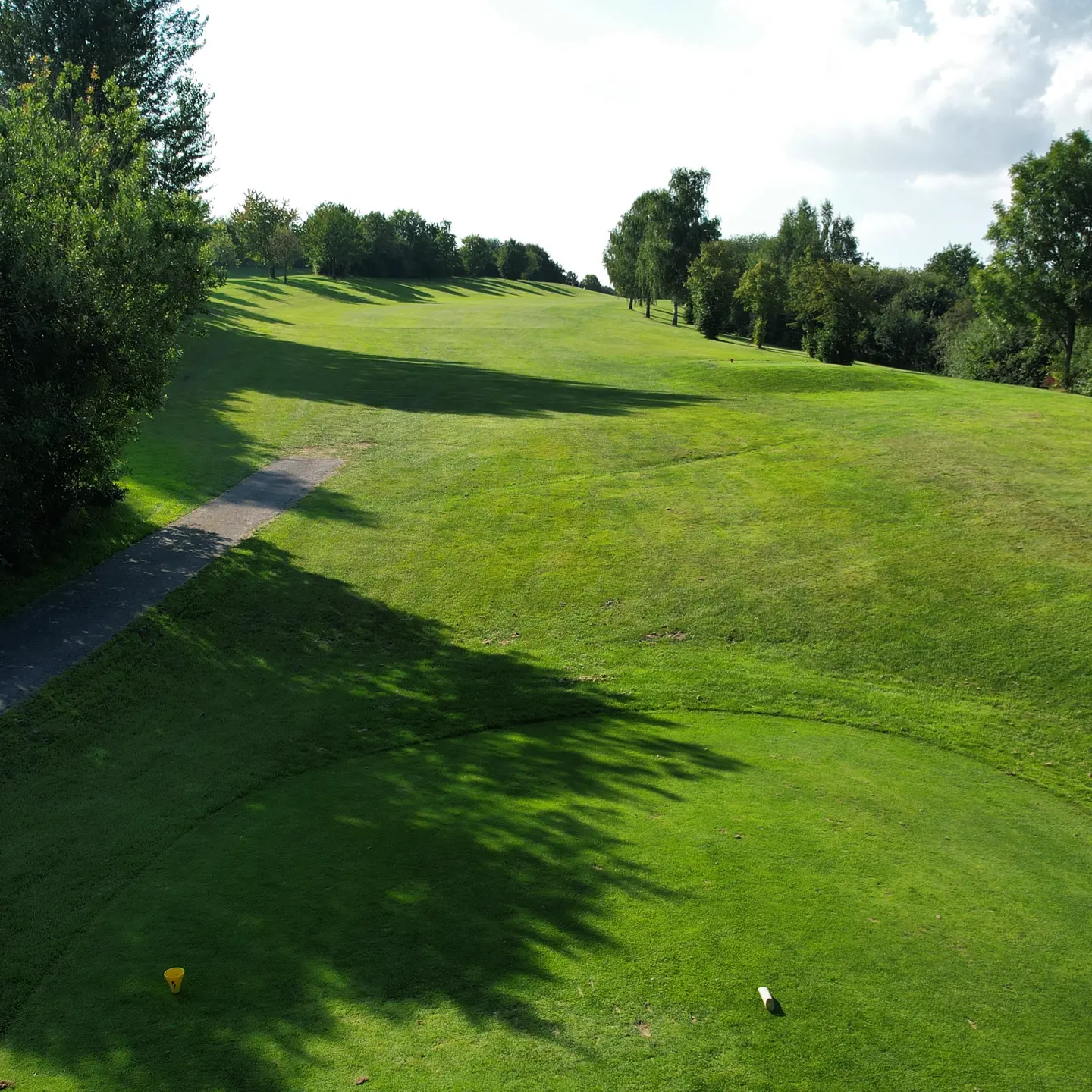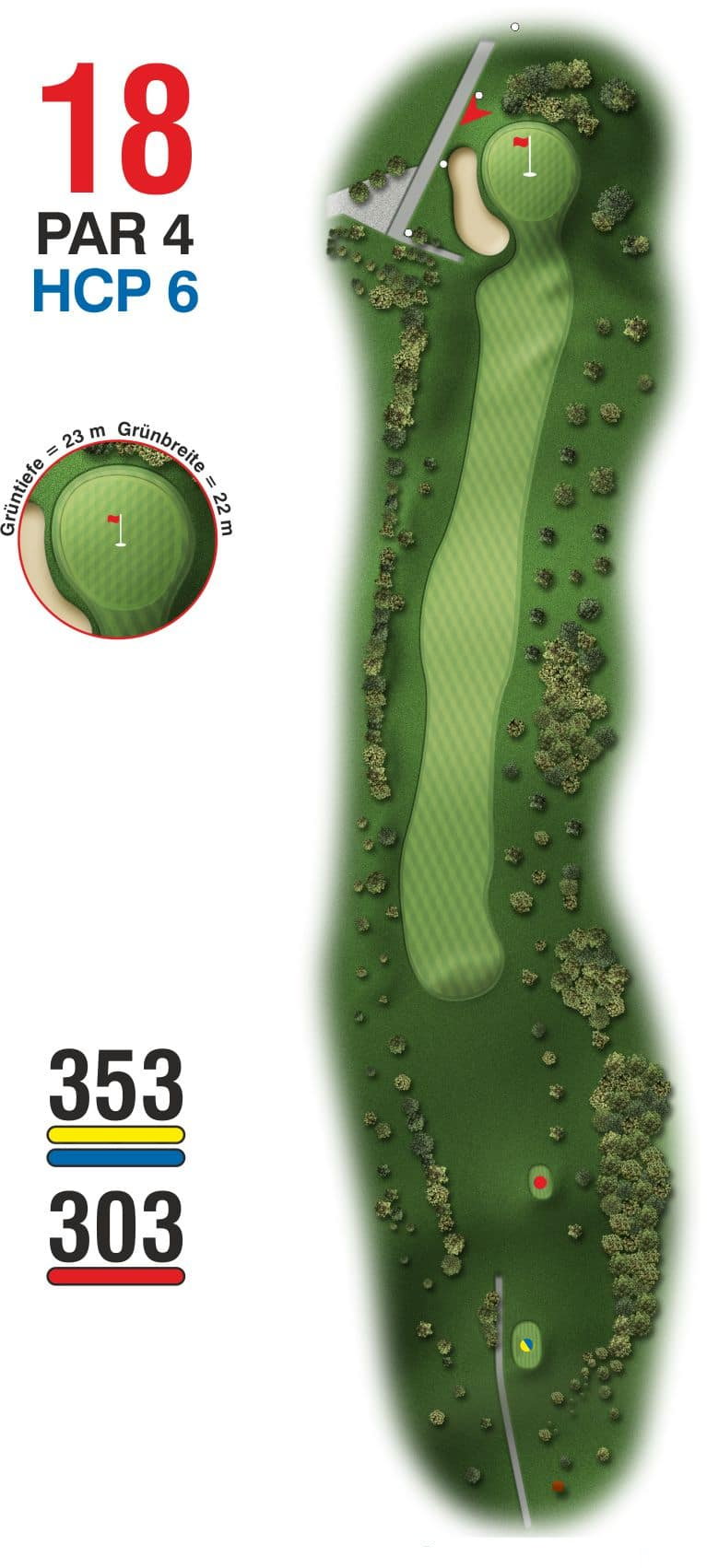 Der Drivebereich wird rechts durch eine abfallende Böschung begrenzt. Das Grün in unmittelbarer Nähe des Clubhauses wird links von einem großen Bunker umrandet. Rechts und hinter dem Grün befindet sich wieder eine Böschung und es geht steil bergab.