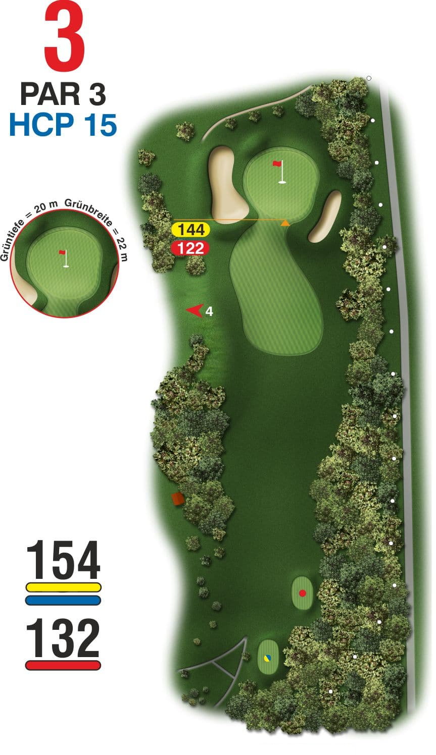 Dieses Par 3 sollte immer von links angespielt werden, nur so haben kurz gespielte Bälle die Chance noch das Grün zu erreichen. Auf beiden Seiten des plateauartig angelegten Grüns befinden sich Bunker.