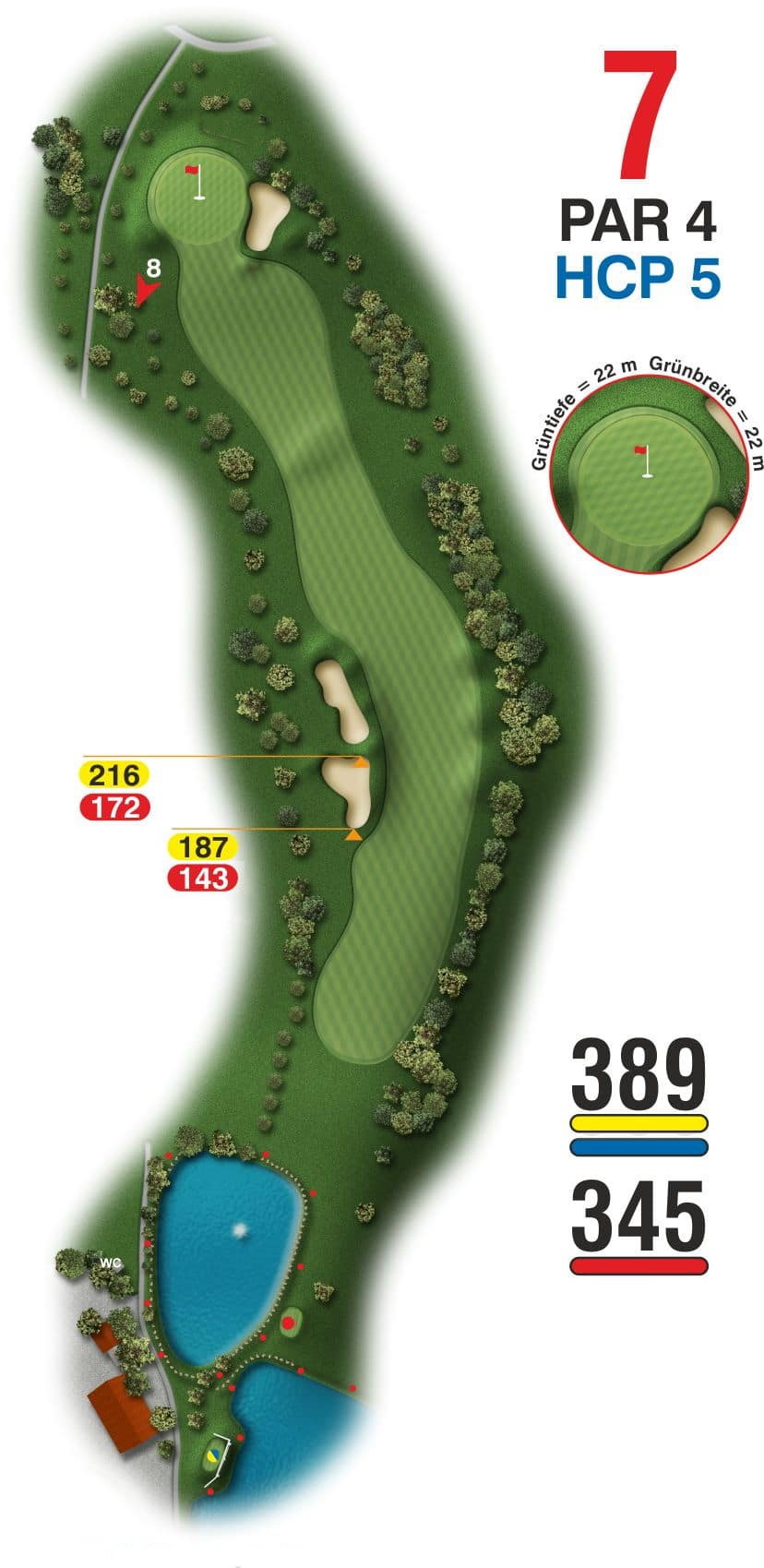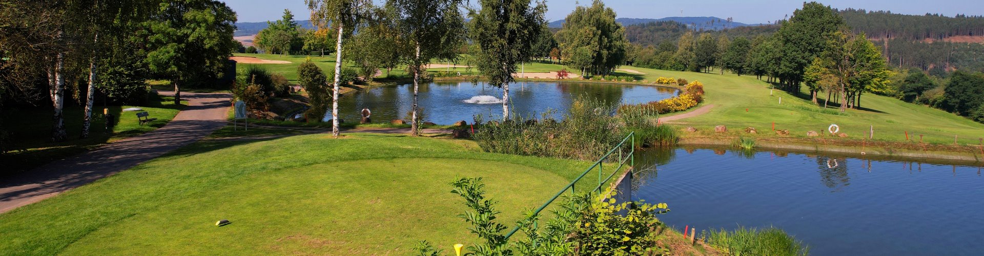 Der Abschlag auf diesem mittellangen Par 4 geht für Herren über einen Teich, für Damen ist er nicht im Spiel. Der Drive auf das Fairway mit Dogleg links sollte rechts neben die beiden Fairwaybunker platziert werden, die sich auf der linken Seite befinden.