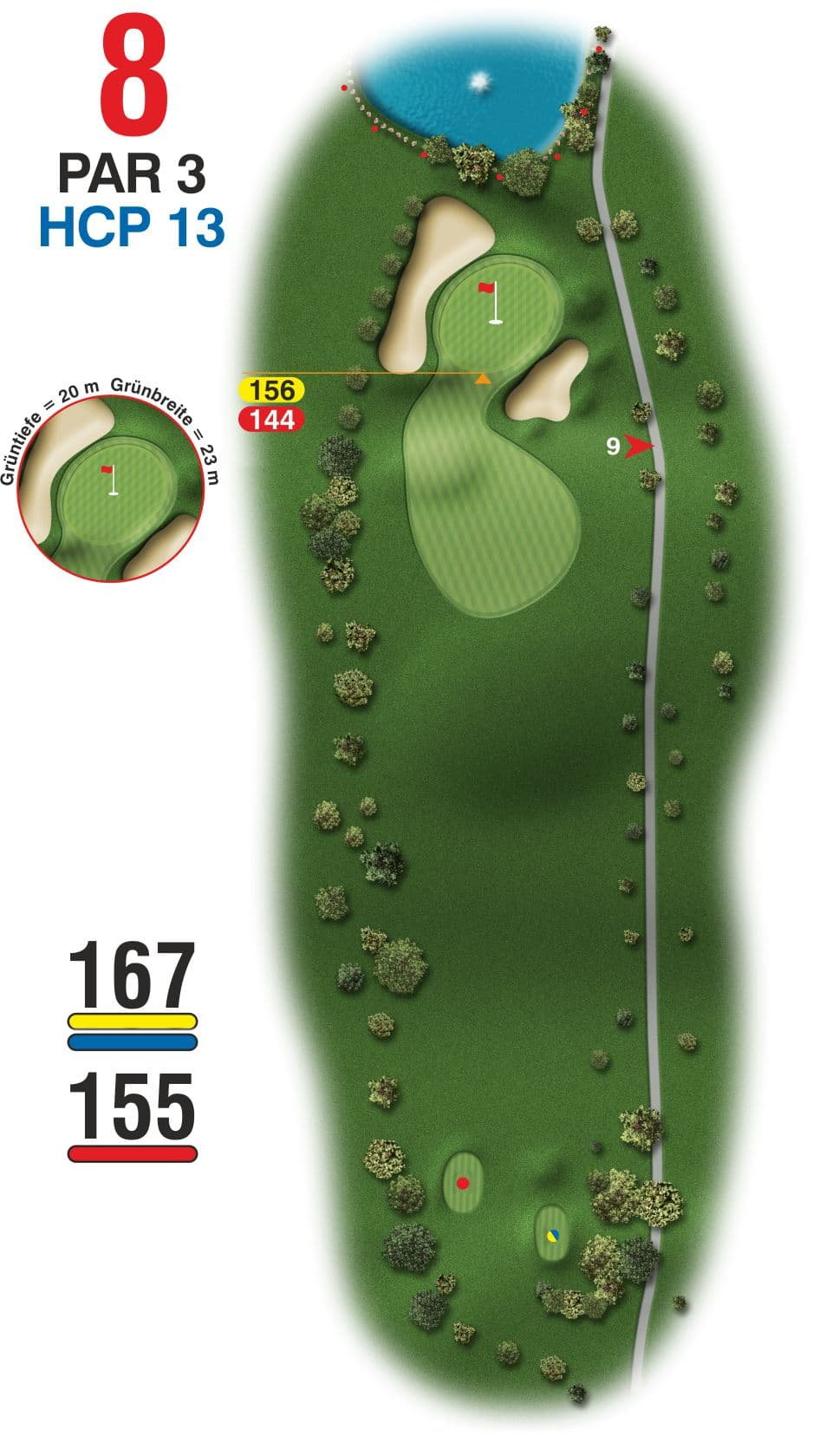 Über das Grün rollende Bälle bleiben in der Regel im flachen Semirough liegen und können zurückgechippt werden, auch wenn ein Teich hinter dem Grün droht. Links und rechts neben dem Grün befinden sich die obligatorischen Bunker.